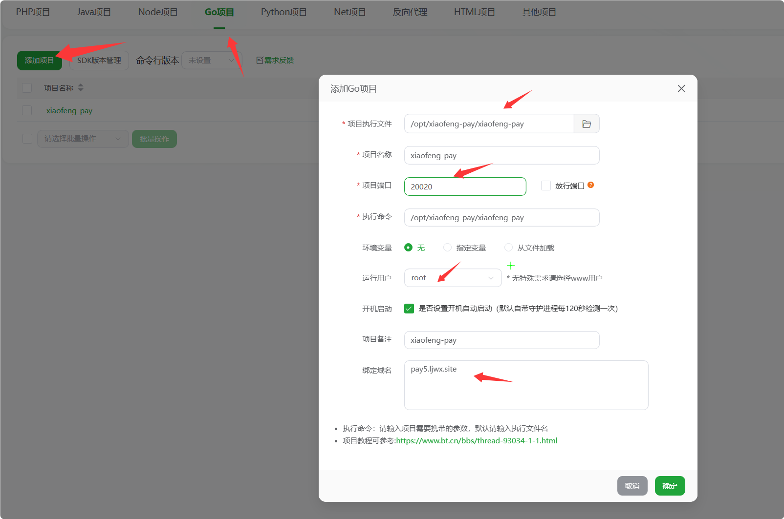 3.添加go项目,默认端口是20020,root运行,绑定域名